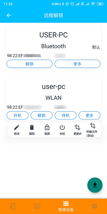 使用區域網路的話,則可以選擇開機(需要滿足網路喚醒WOF的前提)、解鎖、待機、鎖定、關機等,但前提必須是手機和電腦都在同一個區域網路當中。